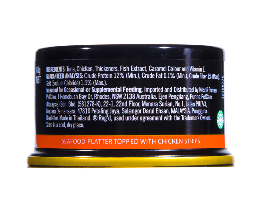 FANCY FEAST® Adult Royale Seafood Platter topped with Chicken Strips Wet Cat Food is a highly palatable wet cat food made for occasional or supplemental feeding. This flavour delivers a unique Fancy Feast taste experience of crustaceans of the ocean topped with chicken strips and glazed in delicious silky broth. This food is part of the Fancy Feast Royale Range, which consists of an extensive array of tasty, mouth-watering flavours. With so many gourmet flavours and textures, even the most fussy eaters will find satisfaction. This highly palatable broth is made with assorted seafood in a rich broth topped with delicious chicken strips to make a delicious treat that your cat will devour.